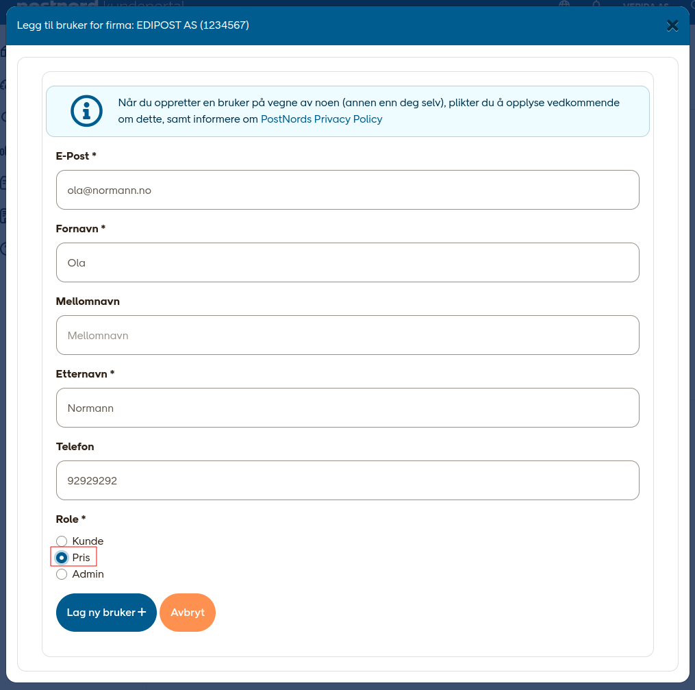 7. Fyll inn brukerinformasjon og kryss av for rolle Pris. Trykk Lag ny bruker.