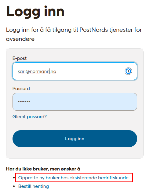 3. Skriv inn e-post og passord og trykk Logg inn. Velg Opprette ny bruker hos eksisterende bedriftskunde hvis du ikke allerede har en konto.